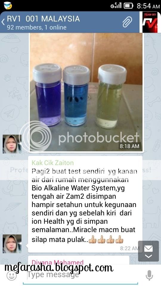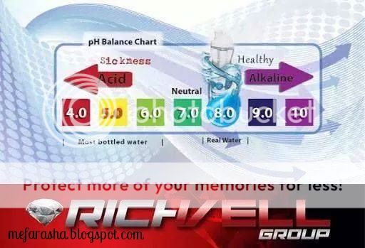 Air yang di minum dari botol ini mampu menukarkan air biasa kepada air alkali yang dapat membantu kita menjaga kesihatan. Air alkali ialah air kedua terbaik selepas air zam-zam. Air alkali penting sebenarnya tapi ramai telan je air berasid asalkan penghilang dahagakan? Sebab rasa & warna air berasid & air beralkali lebih kurang sama. Tapi boleh tengok perbezaan jelas air alkali & air berasid setelah di uji dengan larutan pH. Larutan pH boleh dapatkan dengan pihak Richvell RM18.
